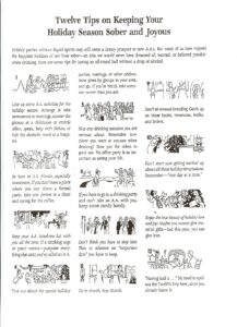 12 Tips for a Sober Holiday By wpadmin | December 22, 2022 0 Comment The attached 12 Tips for a Sober Holiday are available from the A.A. General Service Office each year.